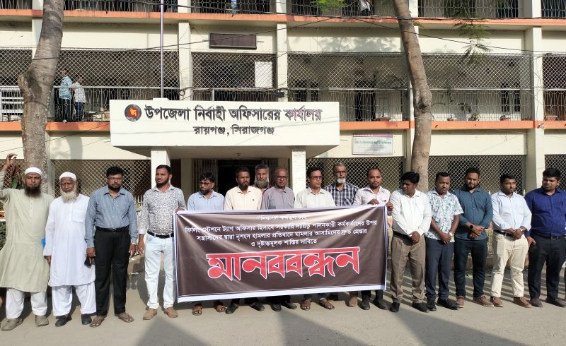 রায়গঞ্জে ফিলিং স্টেশনে দায়িত্ব পালনরত ট্যাগ অফিসারদের ওপর সন্ত্রাসী হামলার প্রতিবাদে মানববন্ধন